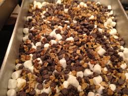 Spread mixture evenly in prepared pan. Bake until a toothpick inserted in center comes out clean, 25 to 30 minutes. Remove pan from oven; sprinkle top evenly with marshmallows, walnuts, and chocolate chips. Return to oven, and bake until marshmallows puff, about 3 minutes. Cool to room temperature on a wire rack, about 1 hour. Then refrigerate until topping hardens, about 1 hour. Use paper overhang to lift from pan; cut into 12 bars.