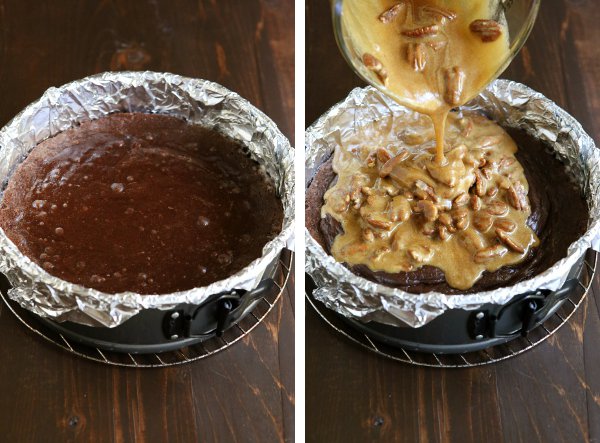 5. After 20 minutes, remove the brownies from the oven and gently pour the pecan pie filling on top, using a knife to evenly distribute it over the brownie batter.